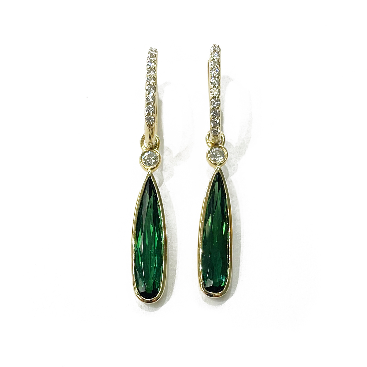 Elongated Teardrop Green Tourmaline Dangle Earrings with 0.30cttw Diamond Accents in 14K Yellow Gold