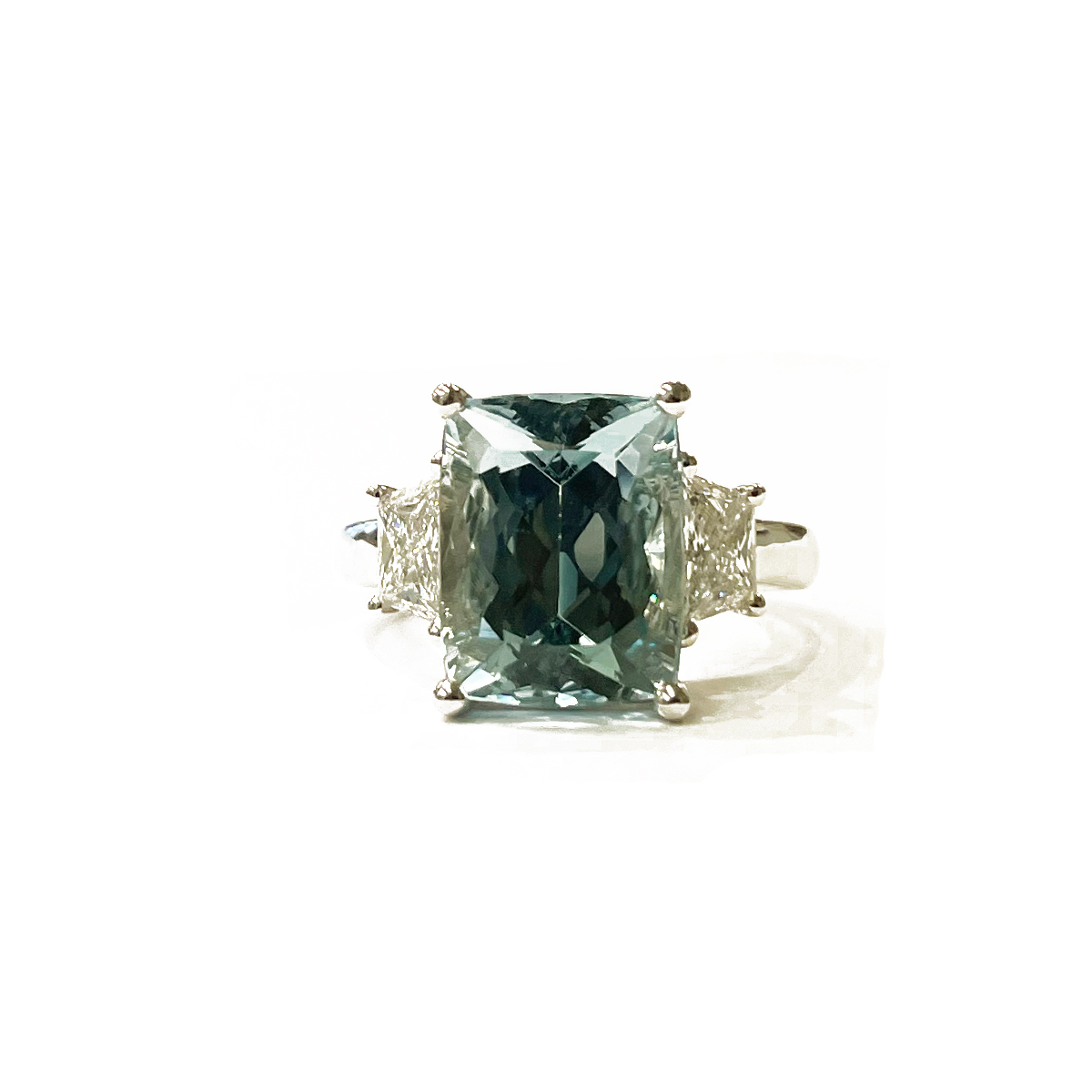 Emerald Cut Blue Topaz Ring East-West Set with Diamond Accents in 14K White Gold
