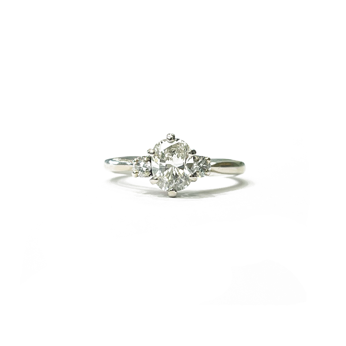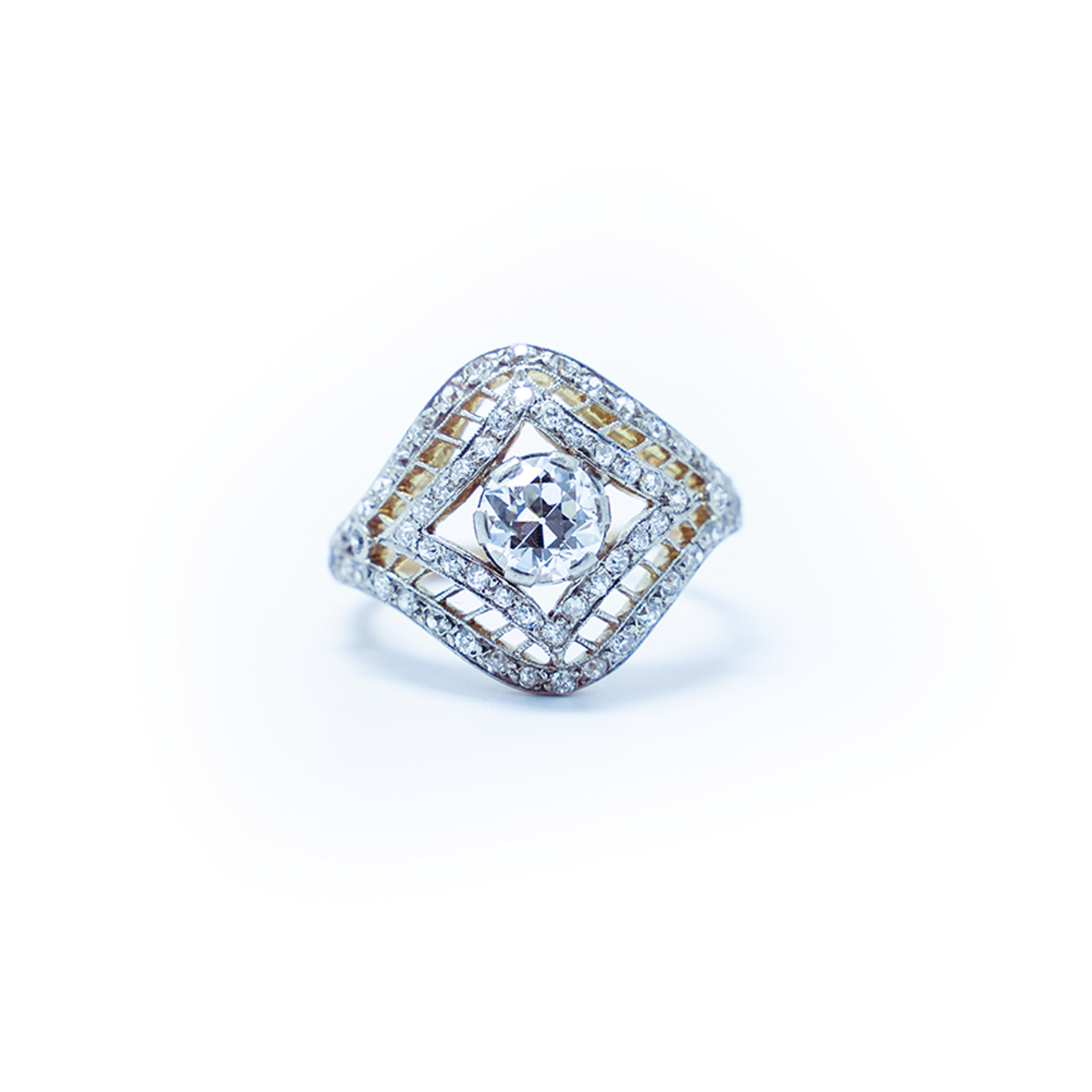 Estate Engagement Ring with a Princess Cut Center Diamond and Diamond Side Stones in Platinum