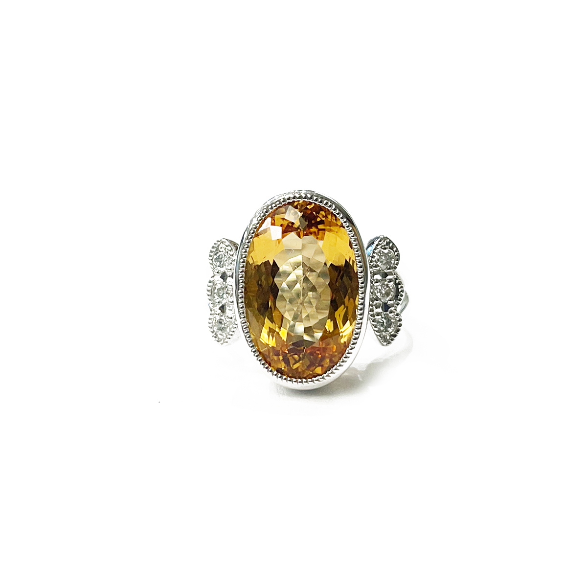 Large, Oval Cut Imperial Topaz and Diamond Estate Ring in Platinum