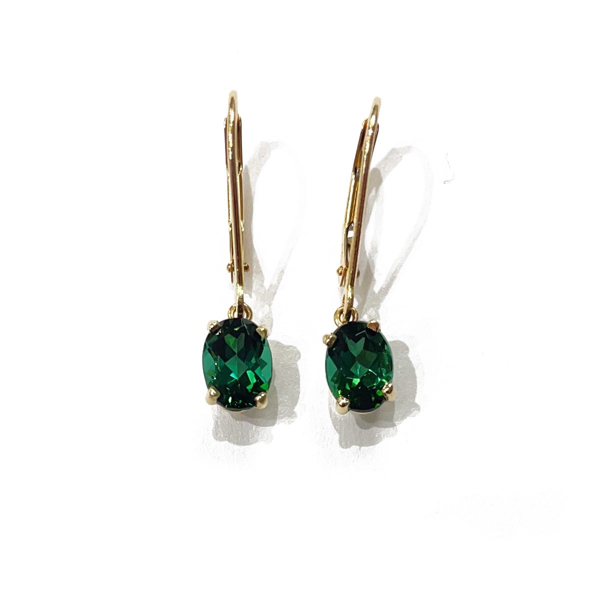 Eye-catching 1.71cttw Oval Cut Richly Hued Indicolite Tourmaline Dangle Earrings Prong Set in 14K Yellow Gold Lever Back Settings.