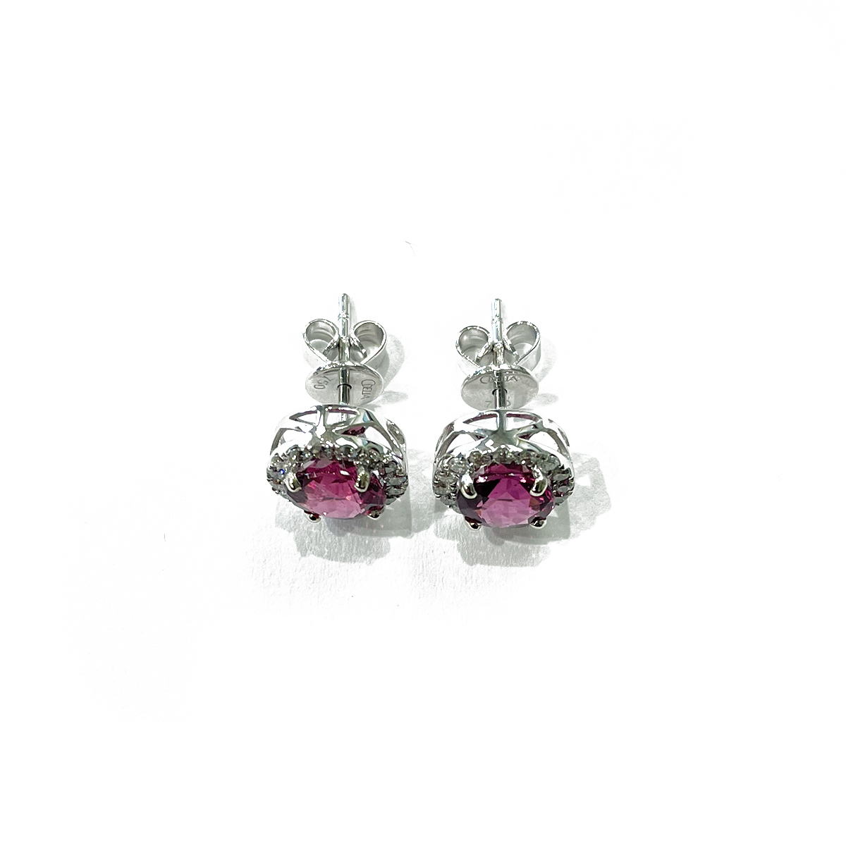 Stunning 2.32cttw Round Cut Pink Tourmaline Stud Earrings with 0.42cttw Diamond Halos Prong Set in 18K White Gold Settings.