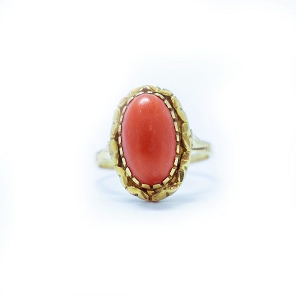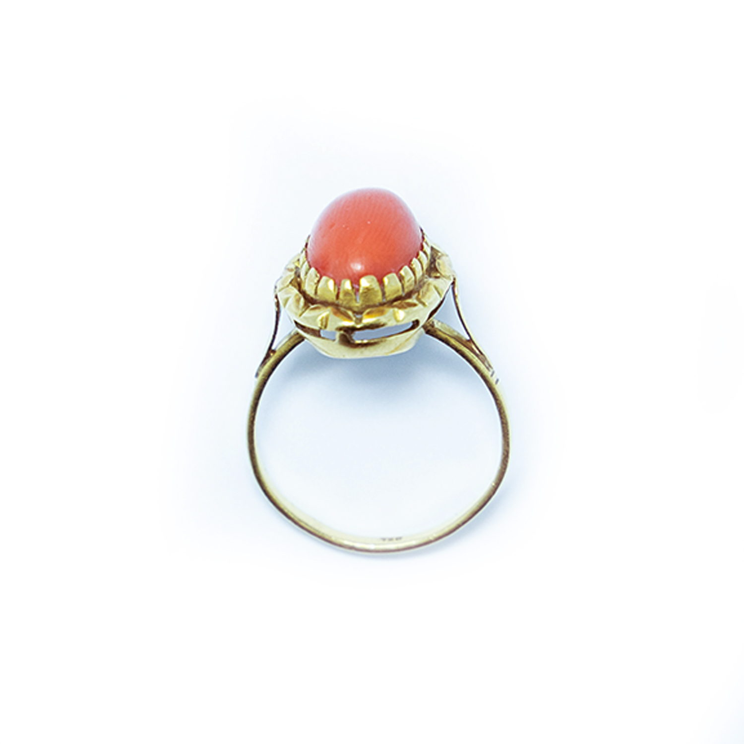 Salmon Colored Cabochon Cut Oval Coral 1950’s Estate Ring Prong Set in 18K Yellow Gold.