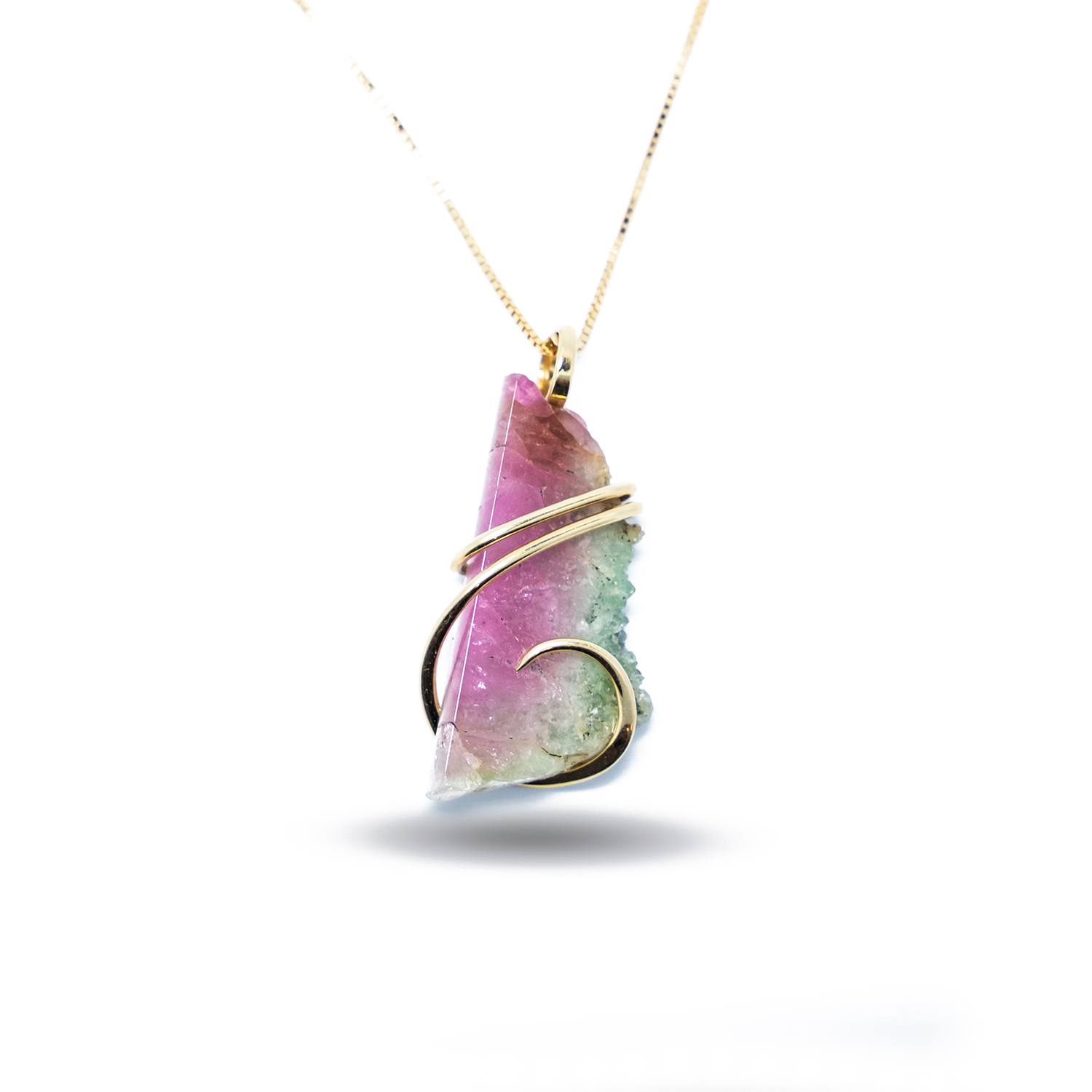 Maine Watermelon Tourmaline Rough Cut Wrap Pendant. The tourmaline is hand wrapped in 14K Yellow Gold on a medium weight 18 inch 14K Yellow Gold box chain. Tourmaline rough cut is absolutely one-of-a-kind as no two pieces are exactly alike.