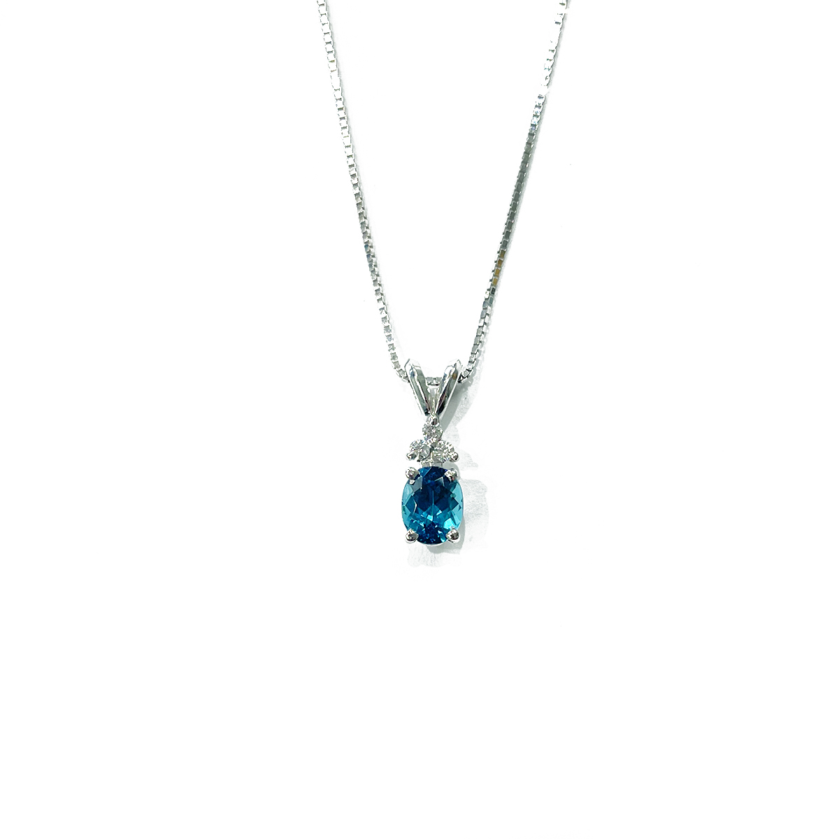 0.95ct Oval Cut Blue Tourmaline with 0.06cttw Diamond Accents Prong Set in 14K White Gold on an 18″, 14K White Gold Box Chain.