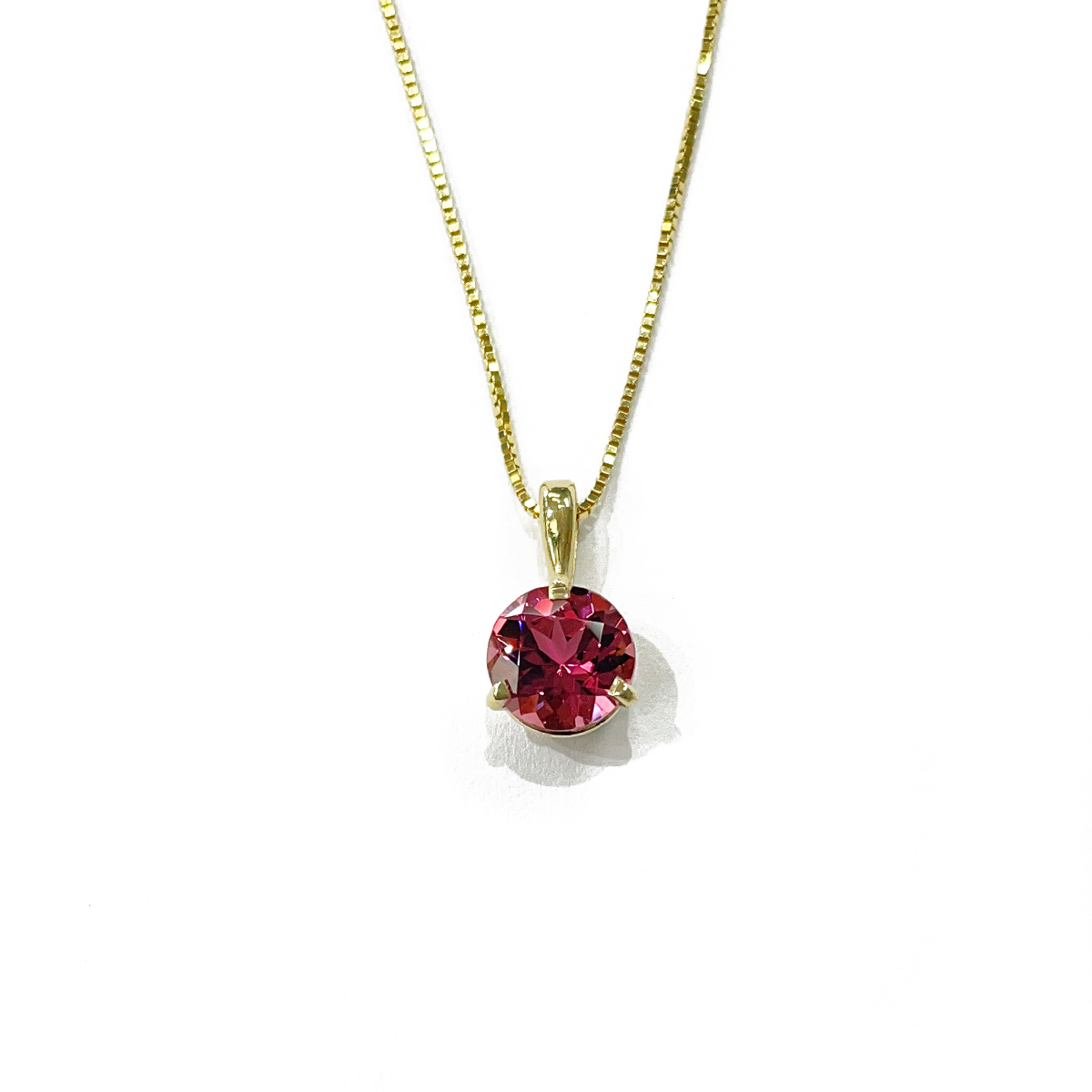 Timeless 1.86ct Round Cut Pink Tourmaline Pendant in 14K Yellow Gold Three-Prong Setting on an 18″, 14K Yellow Gold Box Chain.