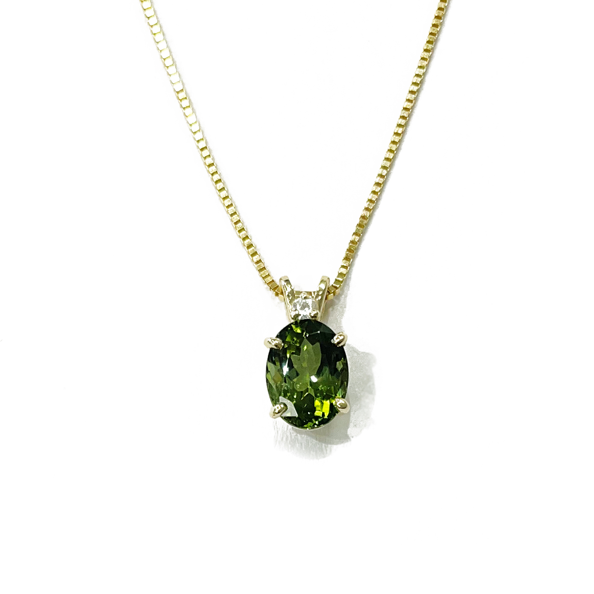 1.54ct Oval Cut Green Tourmaline Pendant with 0.02ct Diamond Accent Prong Set in 14K Yellow Gold on an 18″ 14K Yellow Gold Box Chain