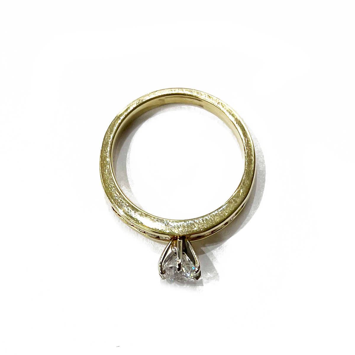 Effortlessly Beautiful 0.50ct Round Cut Diamond Ring Six Prong Set in a Two-Tone 14K White and Yellow Gold Setting with 0.25cttw Channel Set Diamond Accents Along the Shank.