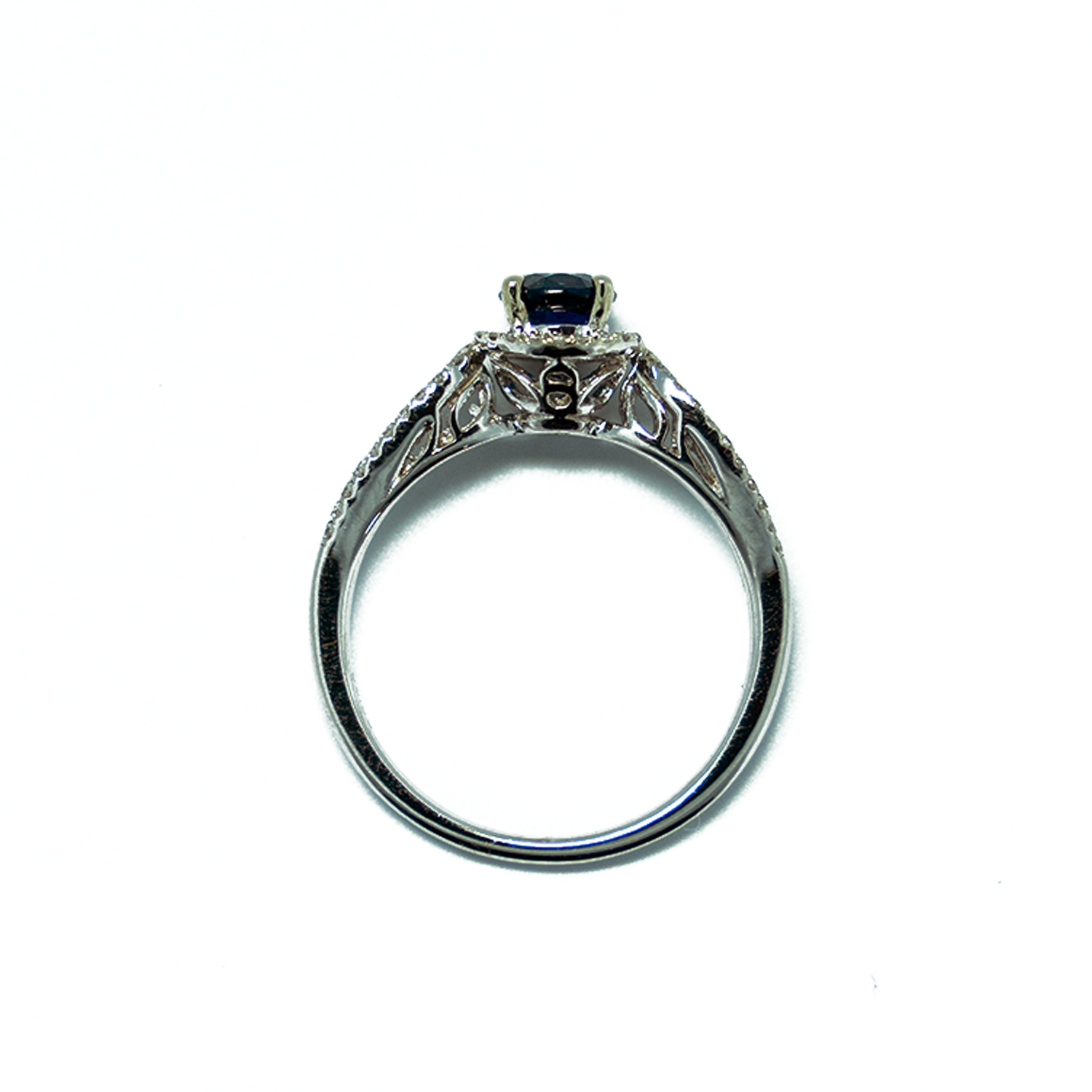 0.64ct Round Sapphire with 0.20cttw Diamond Halo and split shank accent set in 14K White Gold. The center stone and the diamonds are prong set.