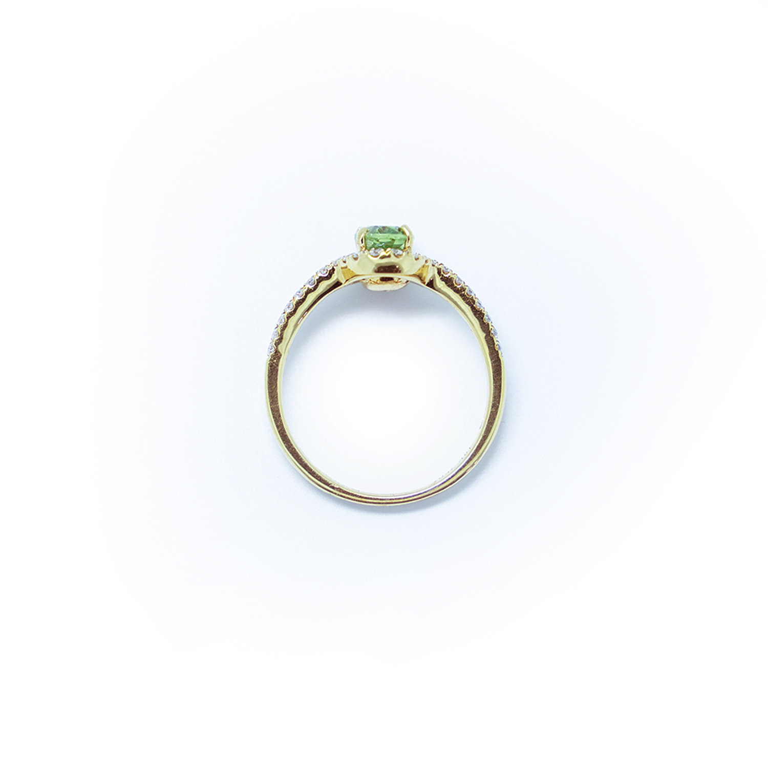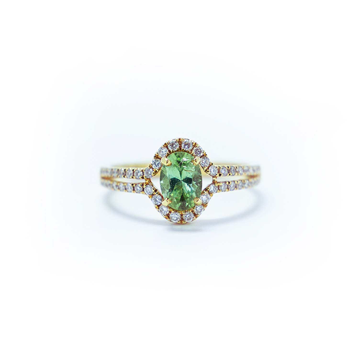 0.81ct Oval Sea Foam Green Maine Tourmaline Ring Prong Set in 14K Yellow Gold with 0.37cttw Diamond halo and split shank accent.