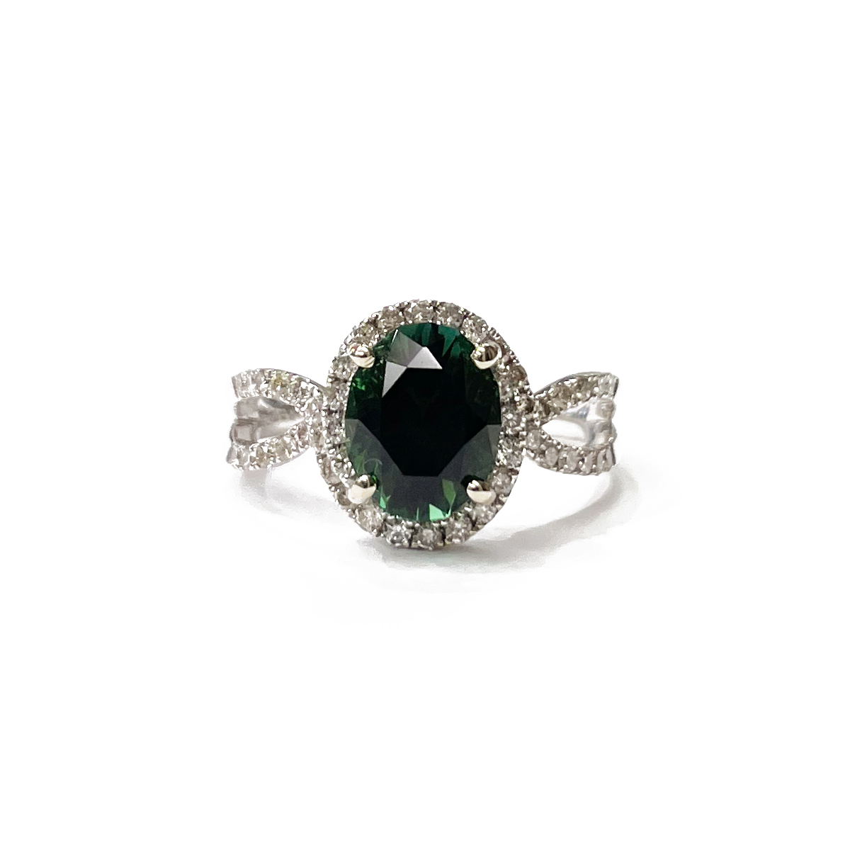 Stunning 2.13ct Oval Cut Deep Green Maine Tourmaline Ring with 0.48cttw Diamond Accents Prong Set in 14K White Gold Accent Setting.