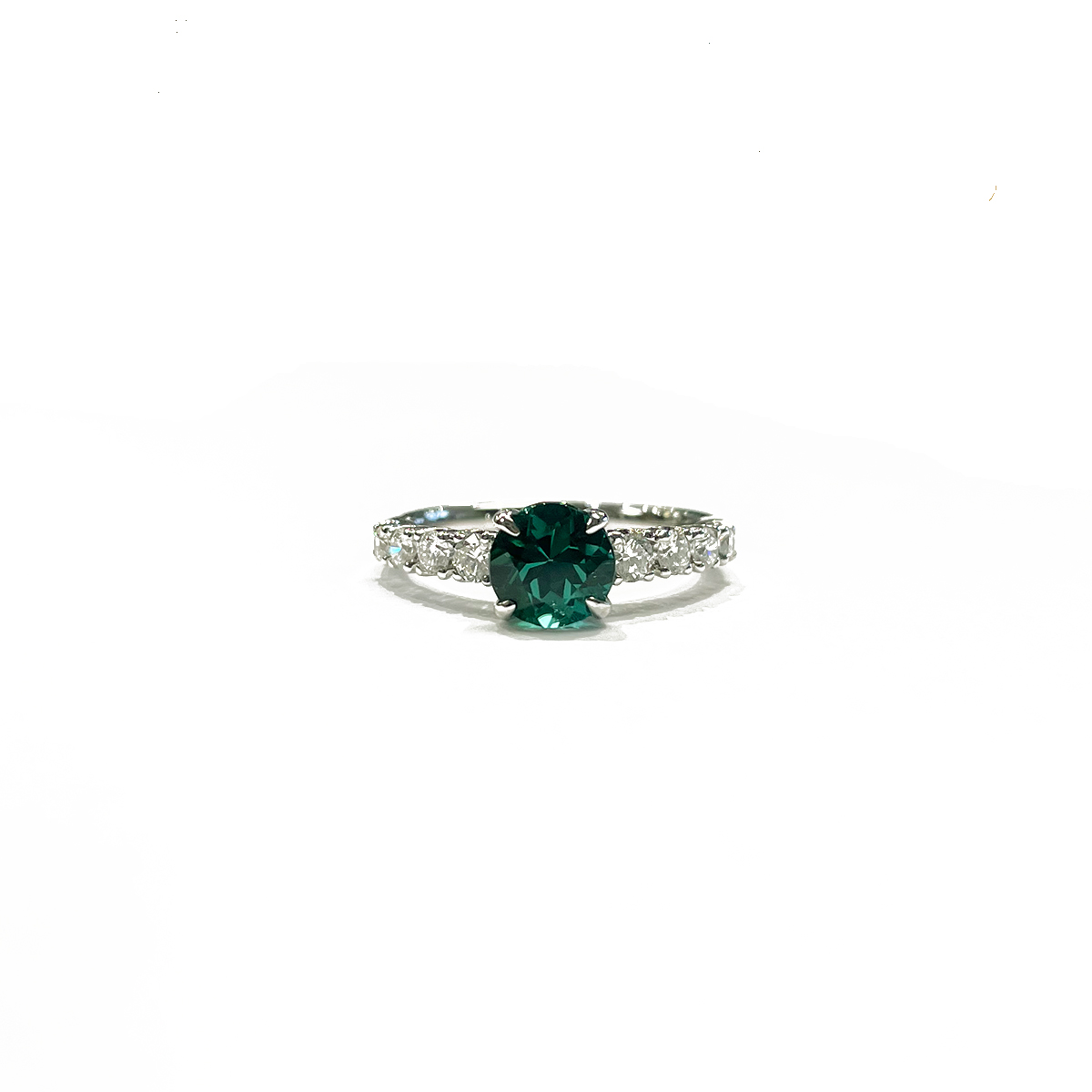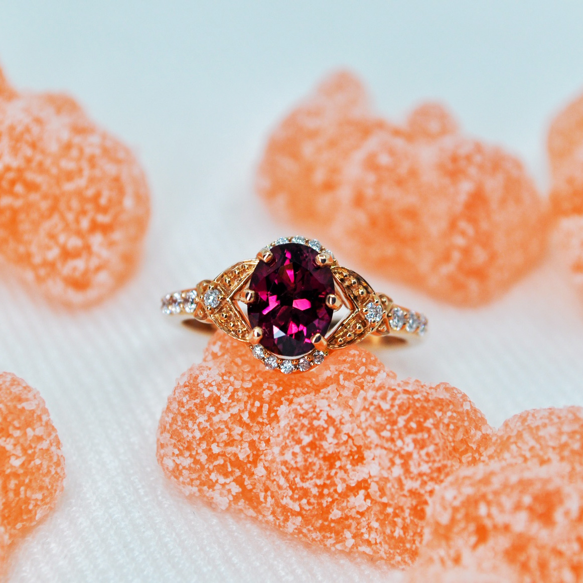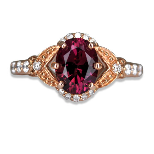 1.31ct Oval rubellite Maine tourmaline prong set in 14K rose gold vintage inspired ring mounting. The ring features 0.19cttw of Diamond accents around the stone and down the shank.