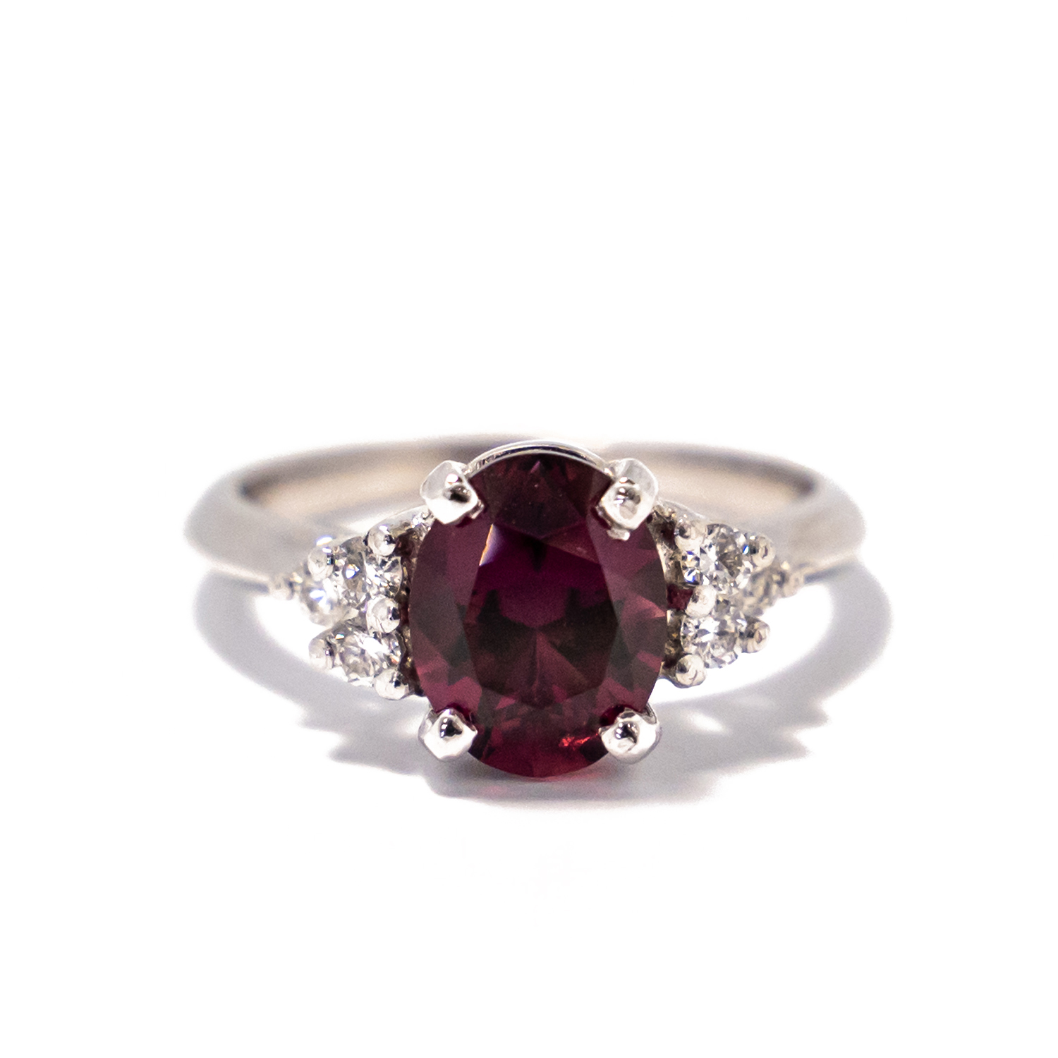 The three small boats known as the Three Dories are a classic symbol of Kennebunkport. As they float on the Kennebunk River the tide moves them slowly and effortlessly. This classic sparkler also brings to mind the spectacular Prelude Fireworks that are seen over the Three Dories in December. This Three Dories Ring features a stunning 1.81ct Oval Cut Pink Maine Tourmaline in an 14K White Gold Ring mounting with 0.20cttw White Diamonds prong set on either side of the Tourmaline.