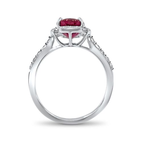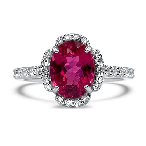1.99ct Oval Pink Tourmaline Prong set in 14K White Gold Ring with Diamond Halo. The ring features 0.34cttw Diamonds in the halo and down the shank.