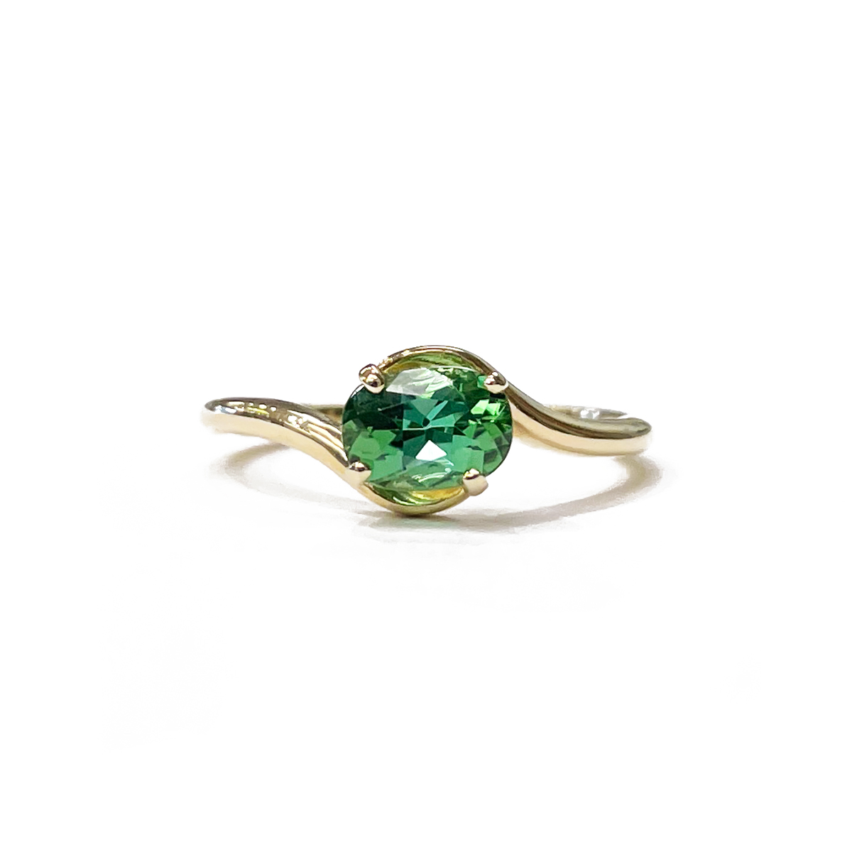 Beautiful 0.91ct Oval Cut Bright Green Tourmaline Ring East-West Prong Set in Stunning 14K Yellow Gold Wave Style Setting.