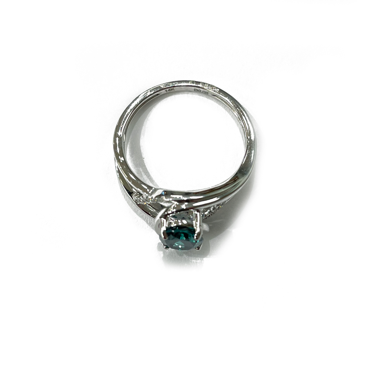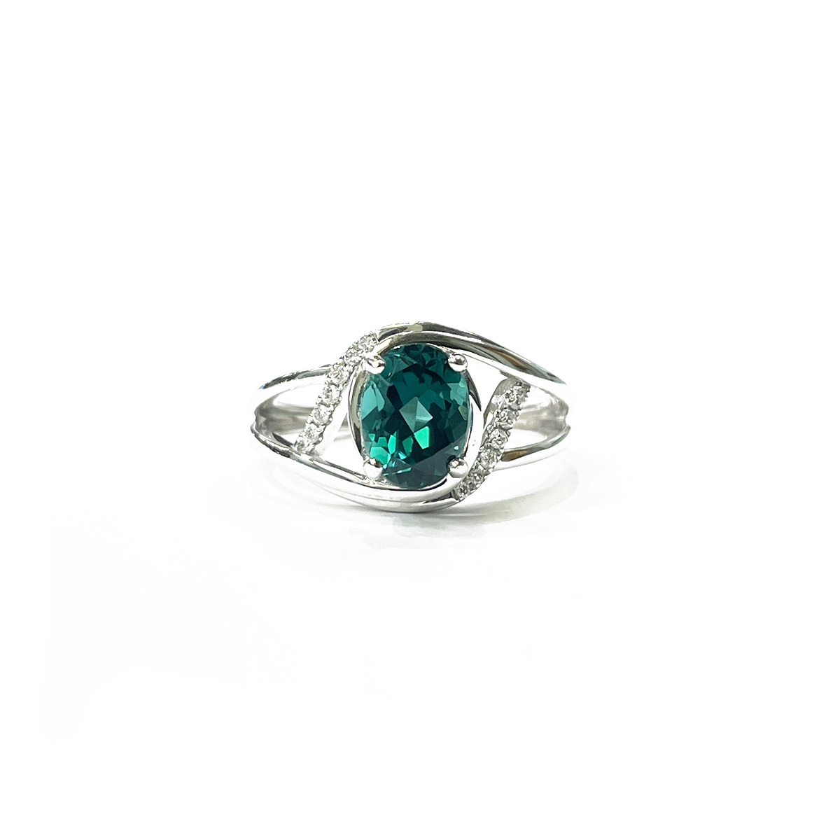 Stunning 1.29ct Oval Cut Indicolite Tourmaline Ring with 0.08cttw Diamond Accents Prong Set in a Beautiful 14K White Gold Double Wave Style Setting.