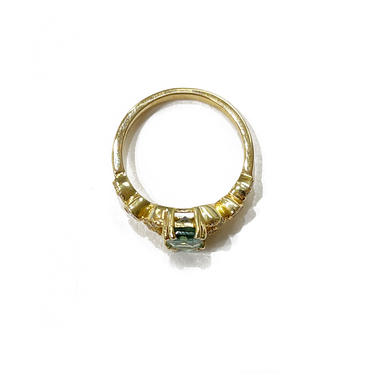 Eye-catching 1.09ct Radiant Cut Maine Green Tourmaline Ring Double Prong Set in 14K Yellow Gold with 0.17cttw Diamond Accents.