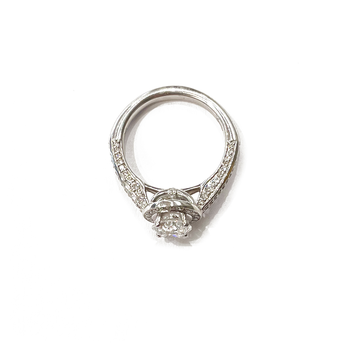 Gorgeous E Color/VSI 1.23ct Round Brilliant Cut Diamond (GIA) Ring with 0.38cttw Diamond Halo and Shank Accents Prong Set in a Platinum Setting.