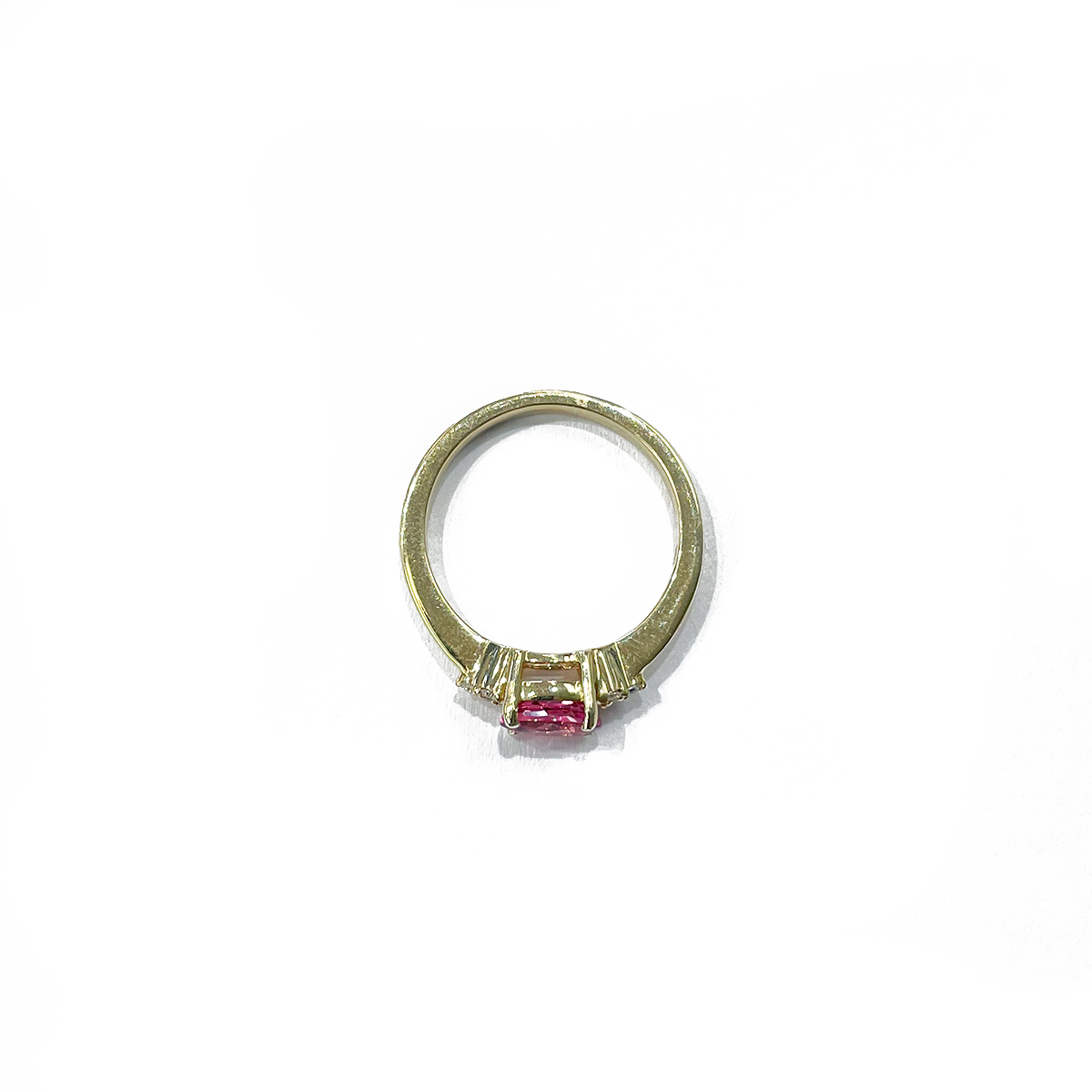 The three small boats known as the Three Dories are a classic symbol of Kennebunkport. As they float on the Kennebunk River the tide moves them slowly and effortlessly. This modern twist of a classic sparkler features a stunning 0.75ct Oval Cut Pink Tourmaline East-West Set in a 14K Yellow Gold Ring mounting with 0.07cttw White Diamonds prong set on either side of the Tourmaline.