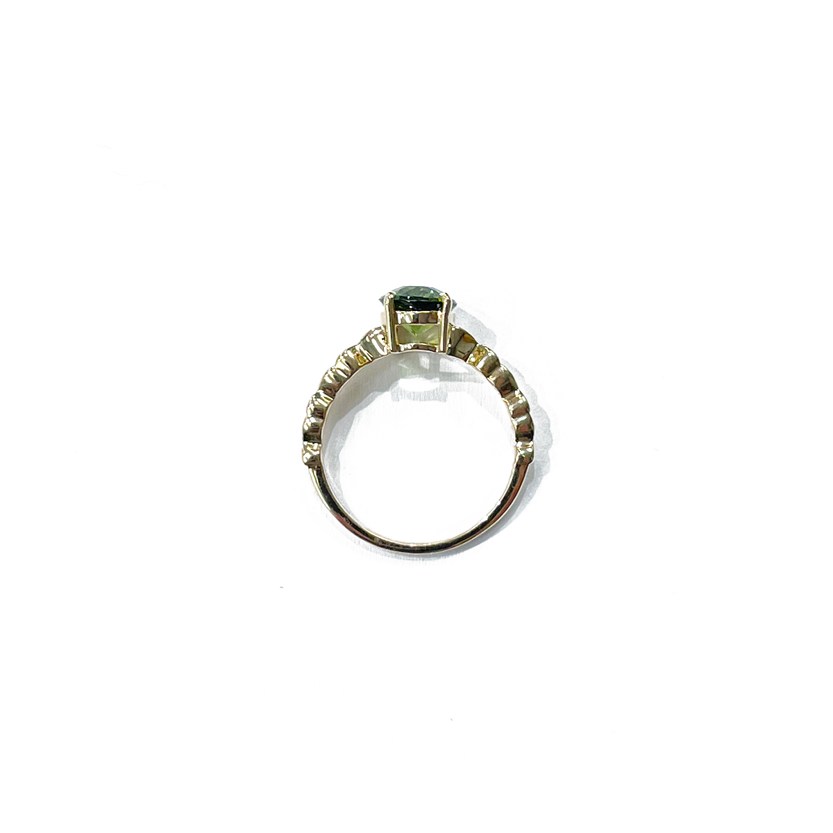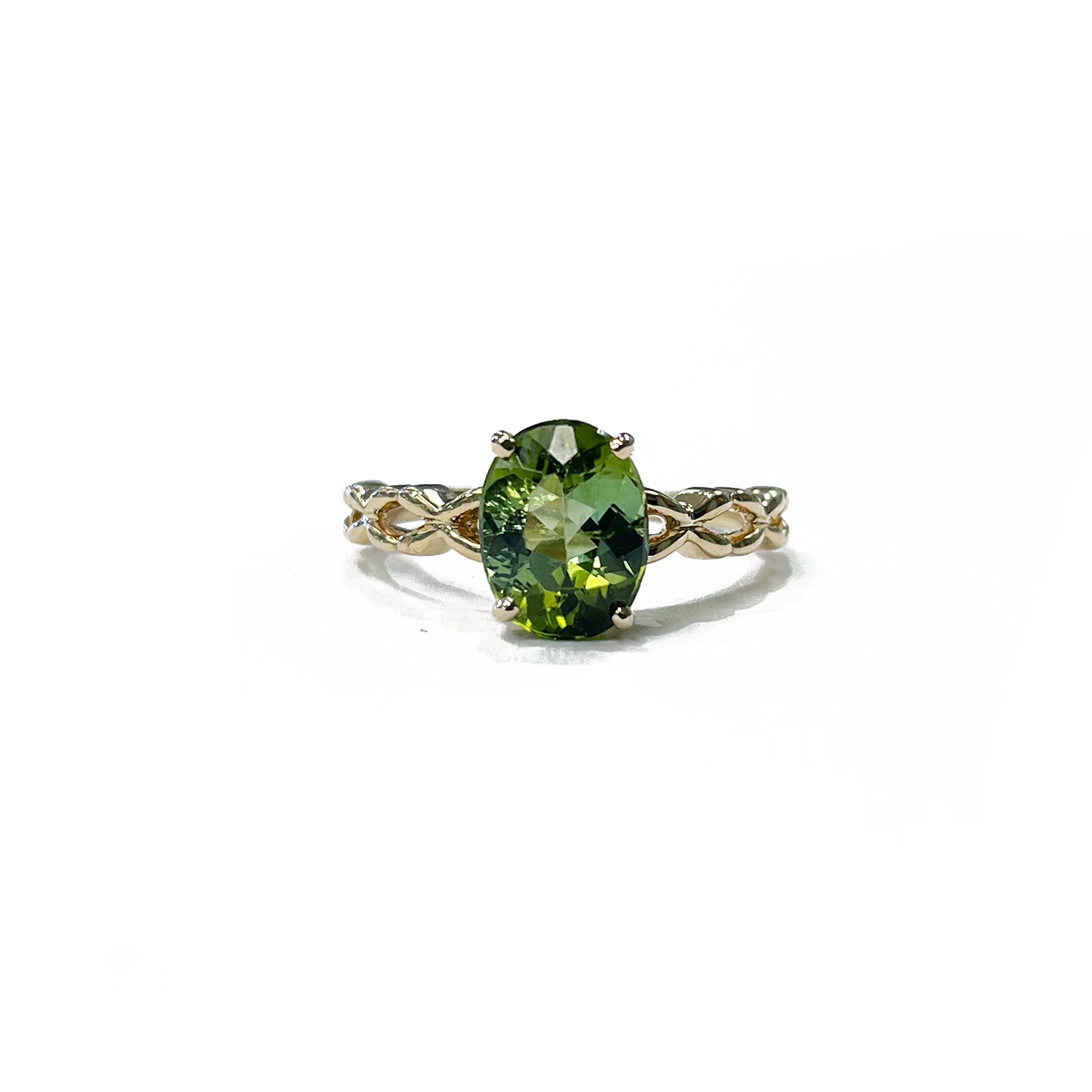1.84ct Oval Cut Green Tourmaline Prong Set in a Simplistic 14K Yellow Gold Setting that Enhances the Natural Beauty of the Gem.
