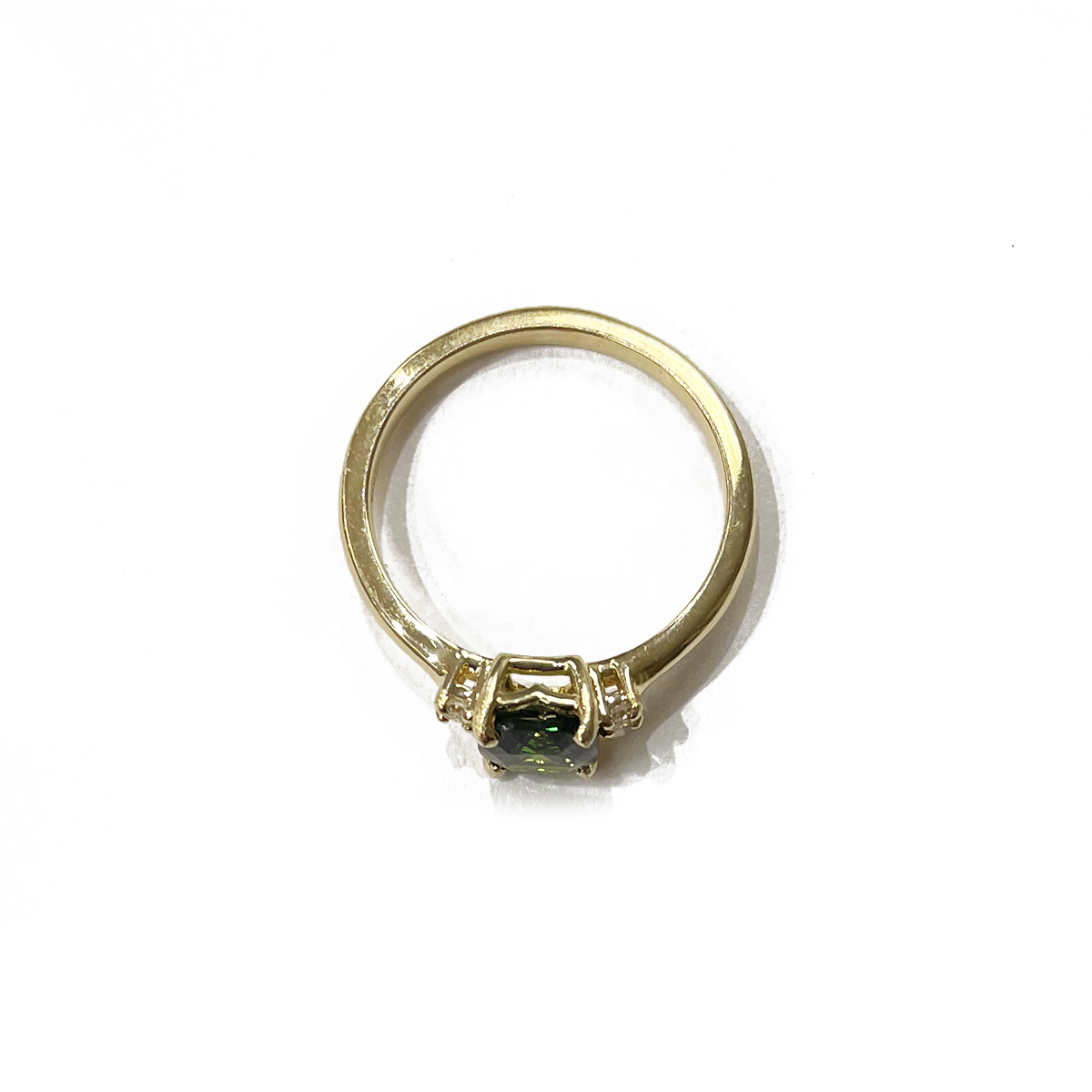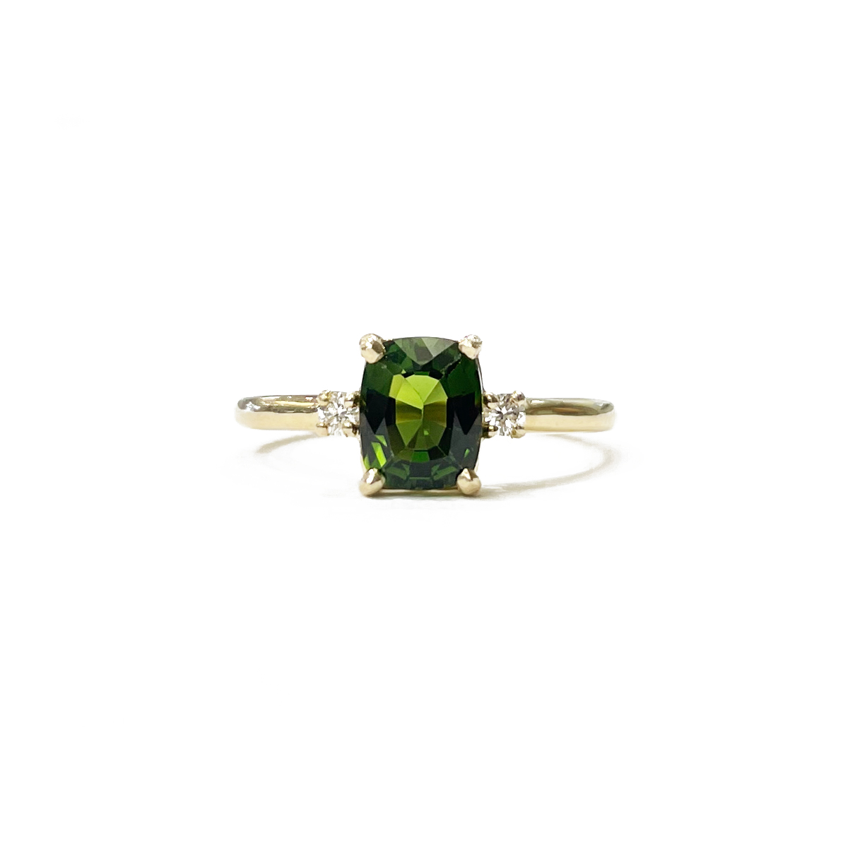Stunning 1.26ct Cushion Cut Maine Olive Green Tourmaline Ring Prong Set in 14K Yellow Gold with 0.04cttw Diamond Accents.