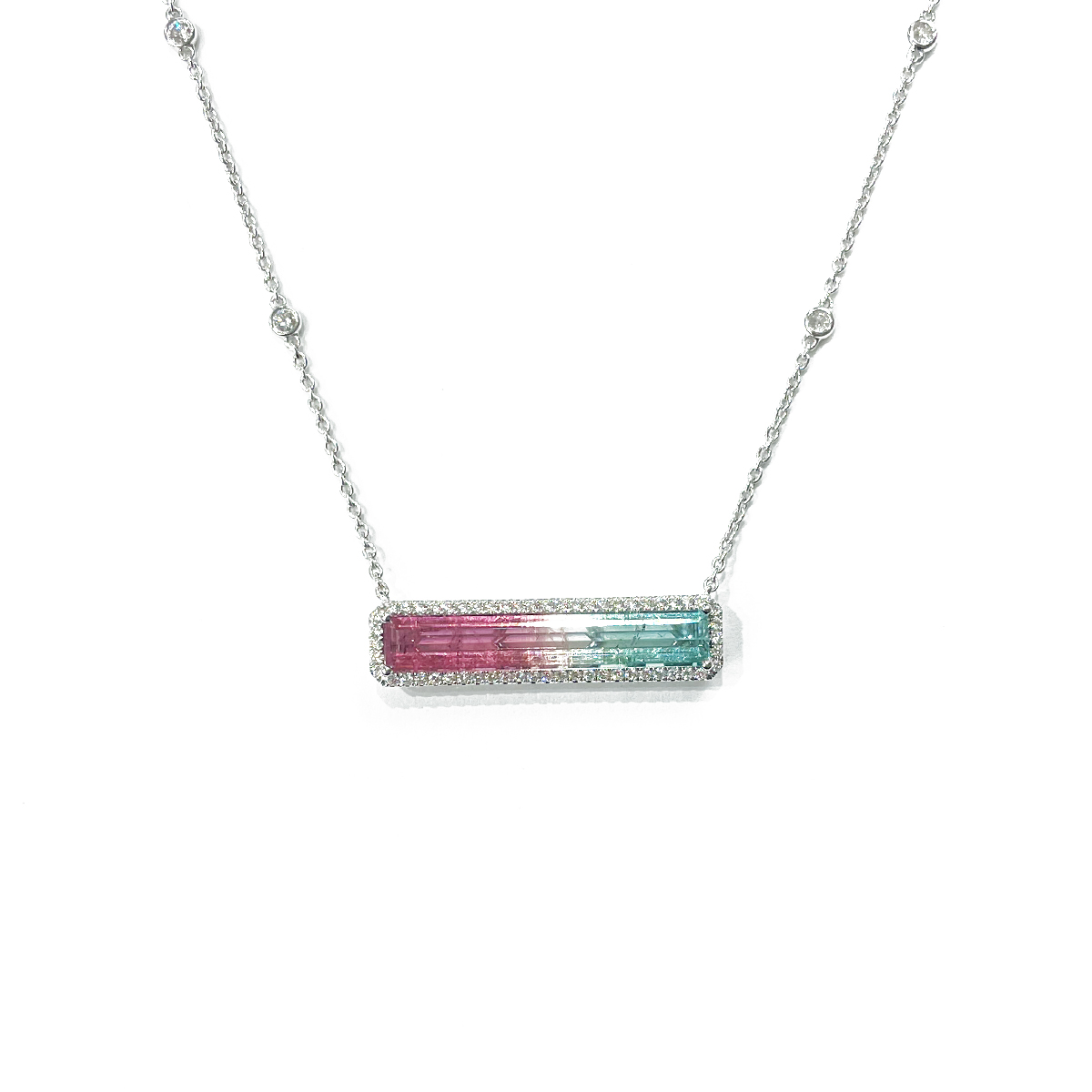 5.34ct Emerald Cut Watermelon Tourmaline East-West Pendant with 0.56cttw Diamond Halo and Chain Accents, Prong Set in 14K White Gold on an 18″ – 14K White Gold Chain