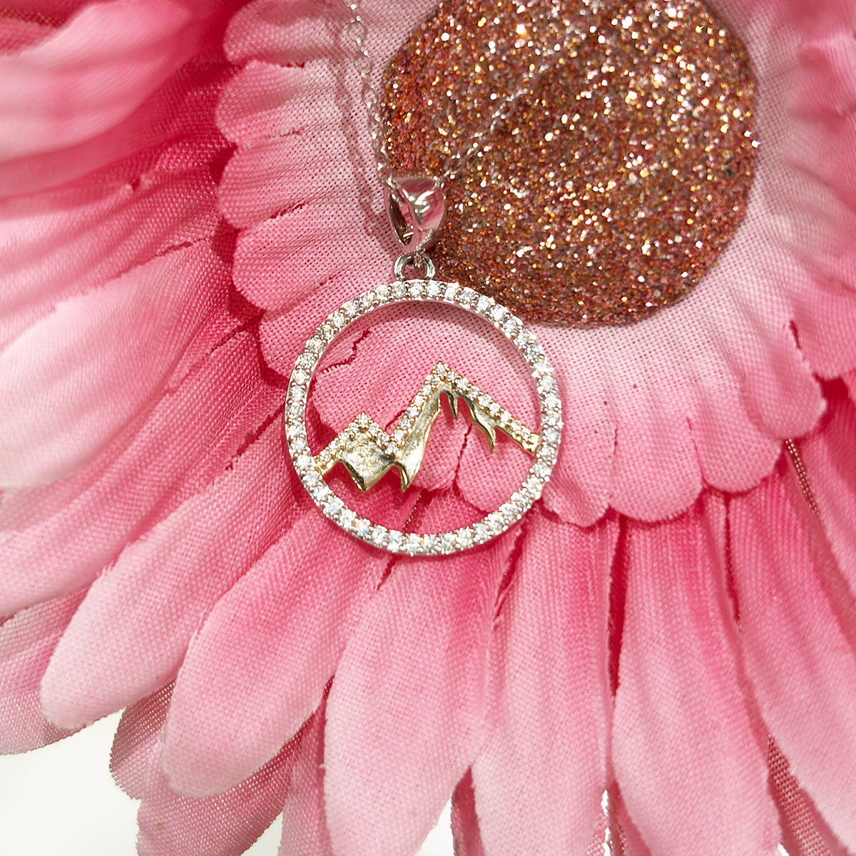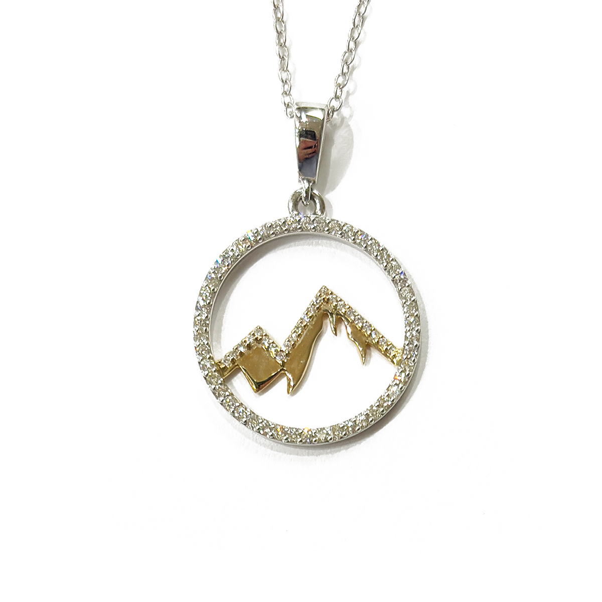 Beautiful Mountain Silhouette Pendant Featuring 0.30cttw Round Cut Diamonds in 14K White and Yellow Gold on an 18″, 14K White Gold Adjustable Chain.