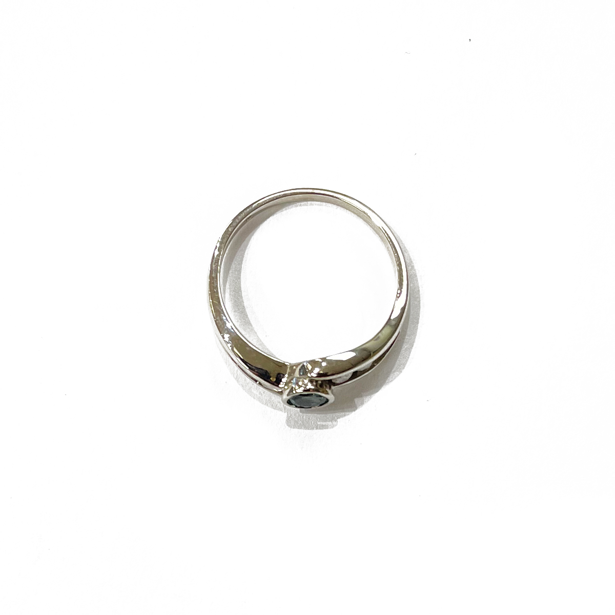 Unique 0.22ct Round Cut Mint Green Maine Tourmaline Ring with 0.12cttw Diamond Accents Bezel Set in 14K White Gold Wave Style Setting.