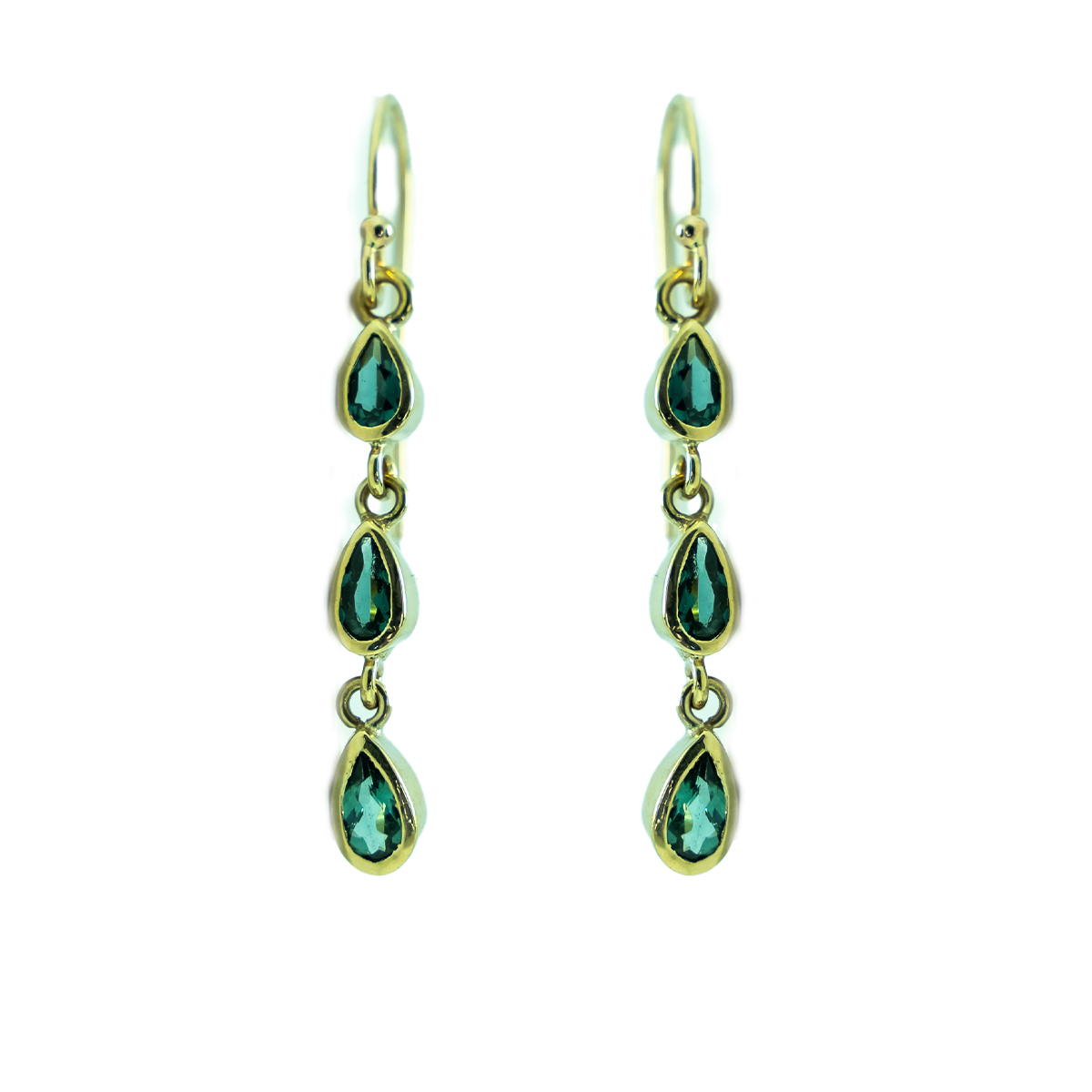 0.76cttw Teardrop Cut Maine Indicolite Tourmaline Dangle Earrings Bezel Set in 14K Yellow Gold.