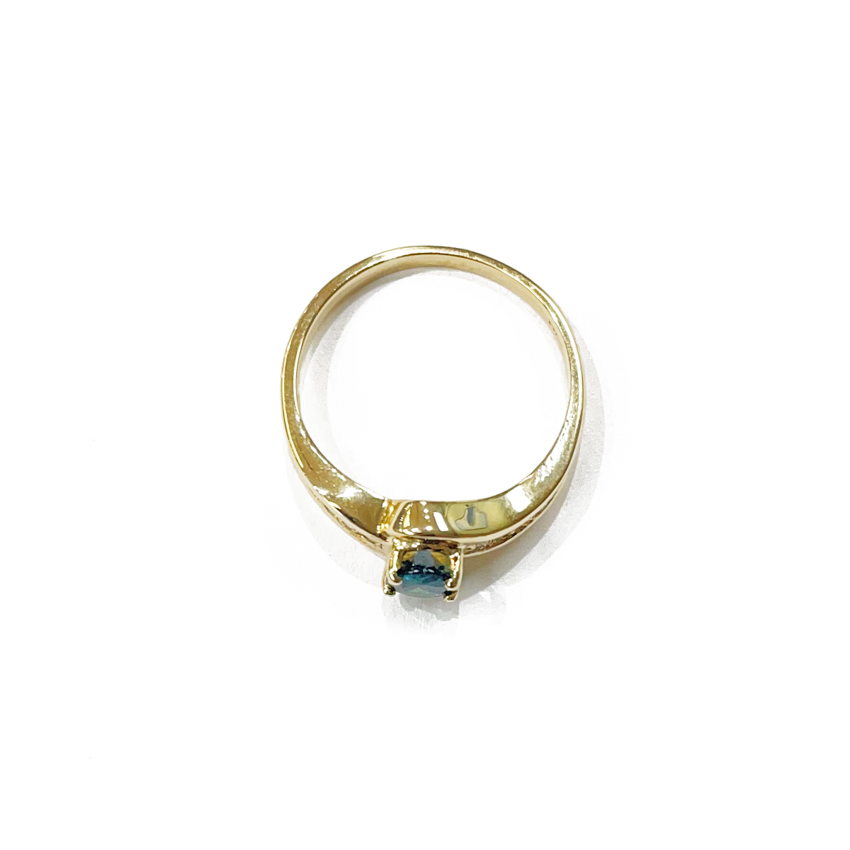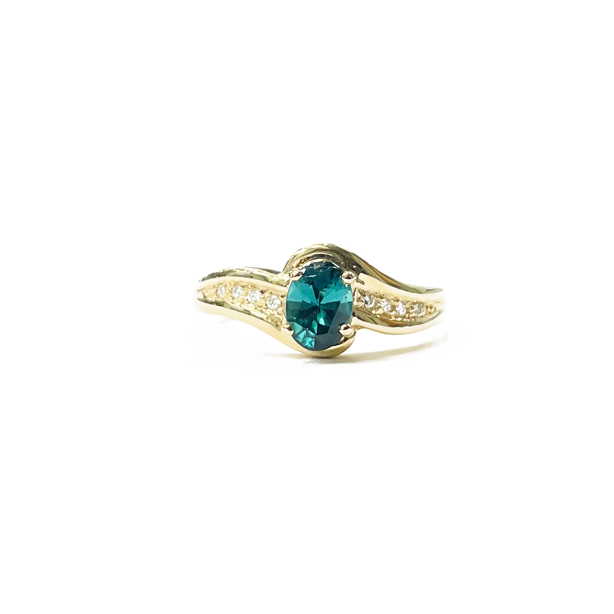 Vibrant 0.45ct Oval Cut Maine Indicolite Tourmaline Ring with 0.05cttw Diamond Accents Prong Set in Beautiful 14K Yellow Gold Wave Style Setting.