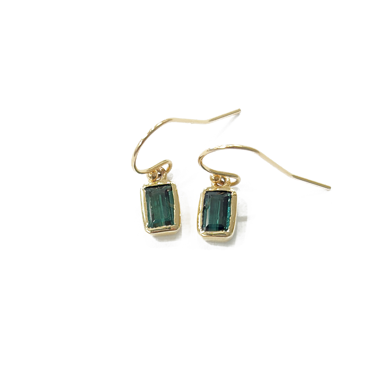 6x4mm Emerald Cut Indicolite Tourmaline Dangle Earrings Bezel Set in 14K Yellow Gold